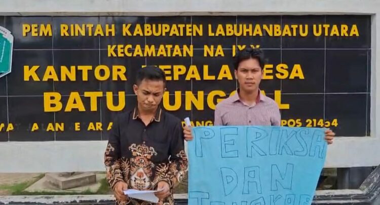 Teks foto: Satuan Pemuda dan Masyarakat Pejuang Rakyat (SAPMAPERA) Kabupaten Labuhanbatu Raya, saat menyampaikan sikap di depan kantor Desa Batu Tunggal. (Ist)