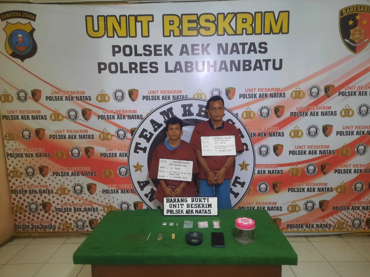 Berbekal dari informasi itu, Kapolsek Aek Natas IPTU SOFYAN SH, MH langsung memerintahkan Team Personel Polsek Aek Natas berangkat ke lokasi dan setelah tiba dilokasi melakukan penggerebekan dan berhasil mengamankan 2 orang laki – laki masing – masing atas nama SM alias Jeneger dan GS berikut barang bukti 1 bungkus plastik klip berukuran Sedang berisikan narkotika jenis sabu dengan berat 1,21 Gram/Brutto, 1 bungkus plastik klip berukuran sedang berisikan narkotika jenis sabu dengan berat 0,36 Gram/ Brutto, 1 bungkus plastik klip berukuran kecil berisikan narkotika jenis sabu dengan berat 0,20 Gram/ Brutto, 1 set plastik klip ukuran sedang kosong, 1 set plastik klip ukuran kecil kosong, 1 buah timbangan digital, 1 buah sekop yang terbuat dari pipet plastik, 1 buah mancis, 1 buah toples kaca, 1 buah Hp merk Oppo warna biru.