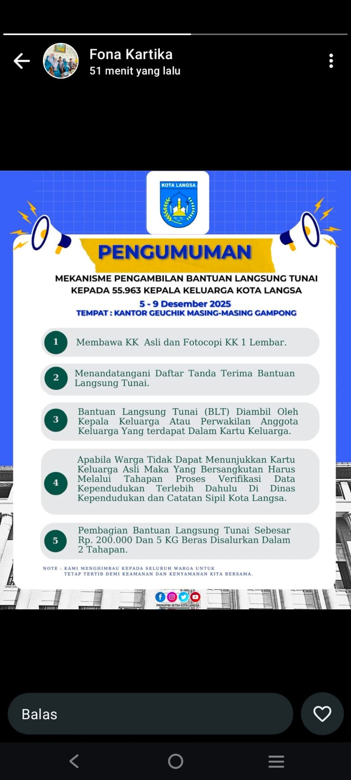 Mekanisme dan syarat penerimaan BLT dan Bantuan Pangan kepada 55.963 KK di Kota Langsa antara lain: