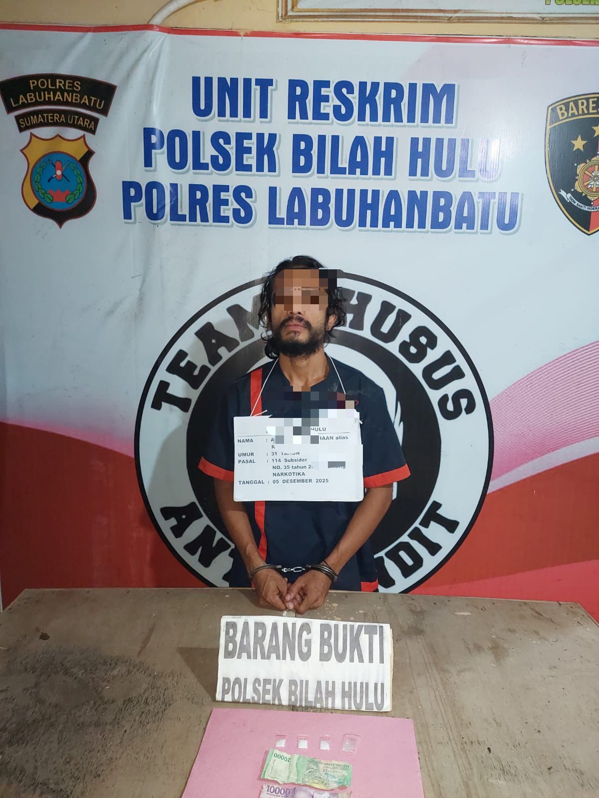 Labuhanbatu, Nusnet.news- Polsek Bilah Hulu Polres Labuhanbatu kembali mengungkap kasus penyalahgunaan narkotika di wilayahnya. pada Jumat, 5 Desember 2025 sekitar pukul 16.00 WIB. Seorang pria berinisial AR alias ROY (32) berhasil diamankan petugas setelah ditemukan membawa paket kecil berisi diduga narkotika jenis sabu di kawasan Kebun Sawit Aek Riung, Kelurahan Sigambal, Kecamatan Rantau Selatan. Sabtu (06/12/2025)