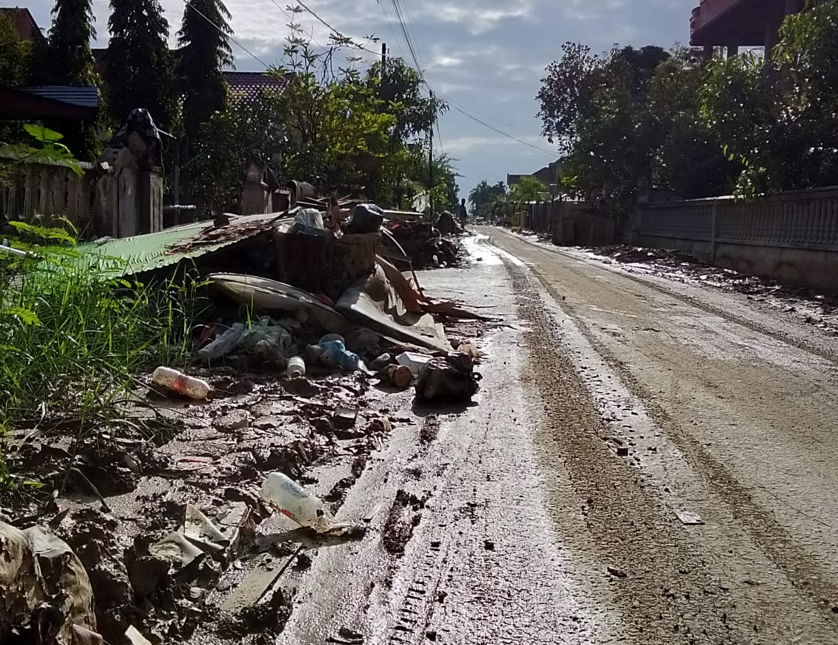 Pantauan media ini, Jum’at, 19 Desember 2025, hampir semua badan jalan di sekitar Gampong Daulat, Kecamatan Langsa Kota, Kota Langsa, Aceh dijumpai tumpukan Lumpur sudah mengeras, tumpukan Lumpur itu tercampur dengan material bahan rumah tangga, dan pecah belah, bisa jadi di dalam tumpukan sampah lumpur ada bekas pecahan kaca atau ada paku bisa membahayakan pengguna jalan.